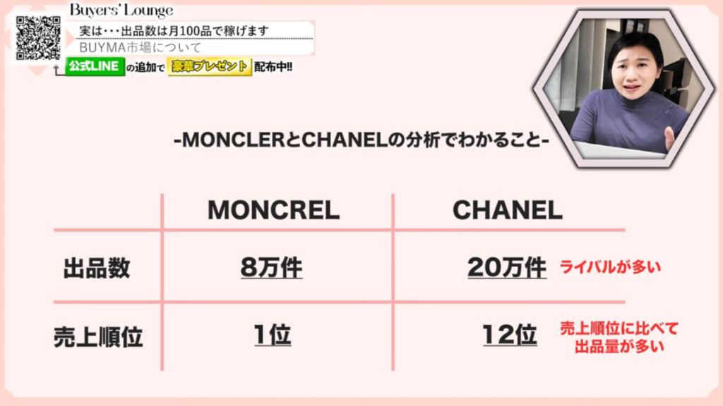 しかし、驚くべきことに、同日の売上ブランドランキングを見ると、1位はモンクレール、2位はザ・ノース・フェイス、3位はプラダでした。注目すべきは、売上1位のモンクレールの総出品数が約8万件であるのに対し、出品数1位のシャネル(20万件)は売上トップ3に入っていないという事実です。